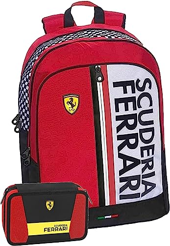 Franco Panini. Schoolpack Zaino Ferrari Rotondo Organizzato Rosso + Astuccio Triplo 3 Zip + Portachiavi Cubo