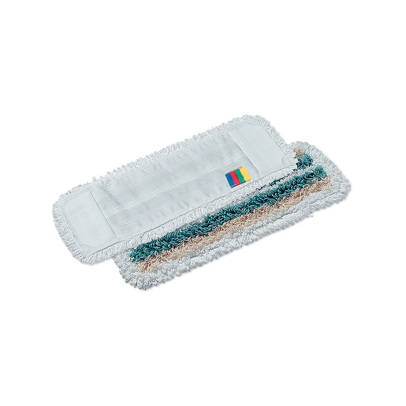 Frangia piatta consigliata per il lavaggio dei pavimenti e per la pulizia di angoli e pareti verticali, composta da un supporto in poliestere con tasche e filo continuo in poliestere-cotone- microfibra. L'azione combinata delle tre fibre consente di ottenere eccellenti risultati di pulizia. La microfibra facilita il distacco delle micro - particelle di sporco, il cotone migliora l'assorbenza della frangia aumentando il metri quadri lavati, il poliestere facilita lo scorrimento del ricambio sul pavimento. Utilizzate con i telai art. 00000877 Metodo di lavaggio: Temperatura di lavaggio 90°C max ( no candeggina, no essiccatoio) Conforme ai CAM Pulizia generale e Pulizia e sanificazione nelle strutture sanitarie (DM 29/01/2021): la microfibra necessita di meno detergente per rimuovere sporco e batteri, riducendo i consumi di acqua e chimico CARATTERISTICHE TECNICHE - Dimensioni cm (WxDxH): 40 x 13 x - Materiale: Supporto = poliestere, Filato = poliestere, cotone, microfibra