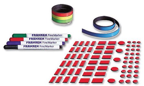 Contiene 20 targhette magnetiche (50 x 10 mm), strisce magnetiche colorate (5 x 2 m), in strisce rosse, verdi, blu e gialle, nastro adesivo trasparente, taglierina e 4 pennarelli (cancellabile a secco;