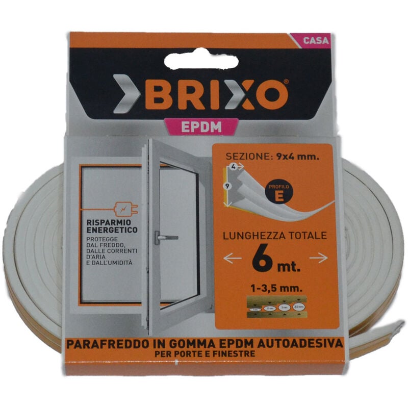 Parafreddo - Marca Brixo - Autoadesivo - In gomma EPDM - Per porte e finestre - Lunga durata - Colore bianco Parafreddo Brixo in gomma EPDM, ad alta qualità, autoadesivo per porte e finestre, protegge dal freddo, dalle correnti d'aria e dall'umidità, facendo risparmiare energia. Protegge da polvere e rumore. Ha una lunga durata e grande flessibilità. Facile e veloce da installare, essendo autoadesivo. Colore bianco. Lunghezza 6 metri. Sezione 9x4 mm.