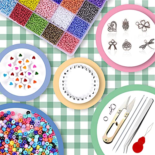 Frasheng 3mm Colorate Perline di Vetro,10000Pcs Perline di Vetro Perline Colorate,240Pcs Alfabeti Perline e Perline a forma di cuore,con Fermagli Aragosta Filo Elastico,per Braccialetti,Collane