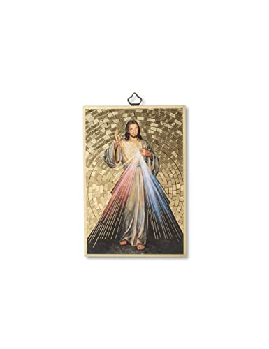 Fratelli Bonella | Quadro Sacro su legno MDF di pioppo 8mm con Mosaico in lamina dorata di Gesù Misericordioso con Coroncina alla Divina Misericordia sul retro 10 x 15 cm | Made in Italy