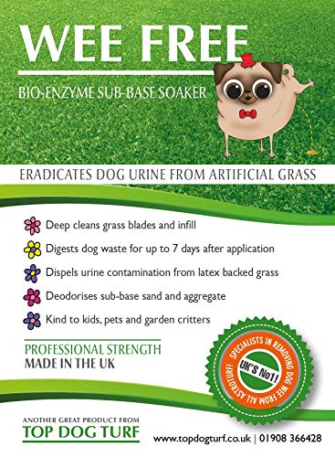 Progettato nel Regno Unito specificamente per i cani: microrganismi ed enzimi benefici nel detergente funzionano subito come un solvente e neutralizza gli odori di urina e cacca di erba artificiale. La sottobase nel vostro astroturf è imbevuta di Wee Free, che agisce come un dissolutore, affrontando il problema alla fonte e non solo mascherandolo come altri detergenti enzimatici. Wee Free è un liquido professionale che funziona come un detergente per erba finta, fino a 5 giorni dopo la pulizia iniziale.