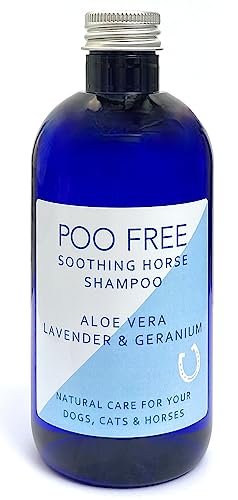 POO FREE 99% Naturale Shampoo CALMANTE per Cavalli - con Aloe Vera, Geranio & Lavanda - 250ml Senza Solfati, Senza Parabeni. Deterge, Calma, Lenisce. per Pelli Sensibili. Formula Concentrata.