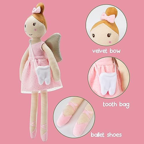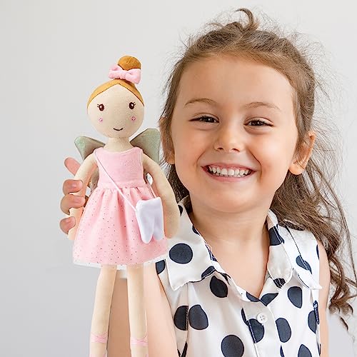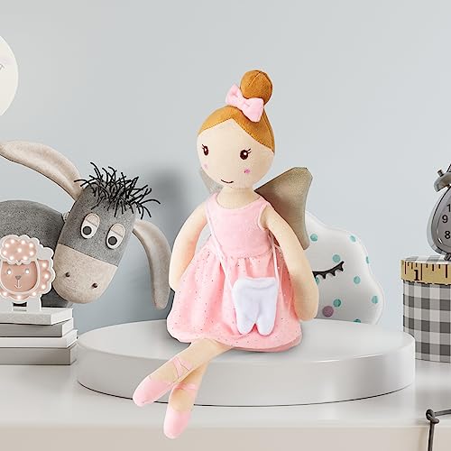 【Design unico】 Grazioso design della fata dei denti con dettagli intricati, tasche dei denti, ali scintillanti e bei vestiti, ogni bambino ha bisogno di un compagno durante gli anni del bambino, vorrà giocare e coccolarsi con lei, sì, un grande giocattolo per neonati, bambini piccoli, bambini e persino adolescenti.