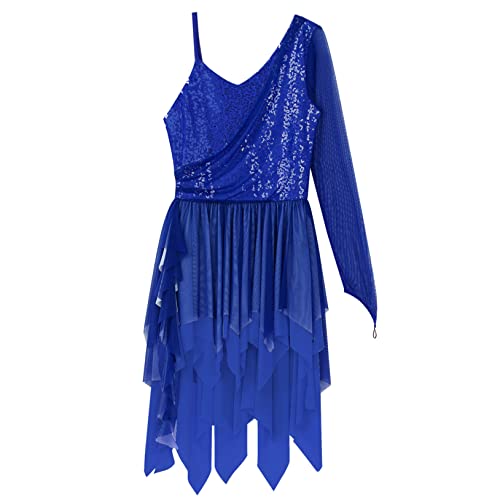 Freebily Abito da Pattinaggio Artistica Donna Paillettes Glitter Body da Balletto Una Spalla Abito da Ballo LatinoVestito Danza Classica Samba Rumba Jazz Danza Moderna Blu XL