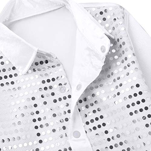 Freebily Camicia da Ballo Latino Bambino Maniche Lunghe Camicia Paillettes Anni 70 Costume Carnevale Halloween Travestimenti Divertenti Abbigliamento Pattinaggio Artistico Bianco 10-12 Anni