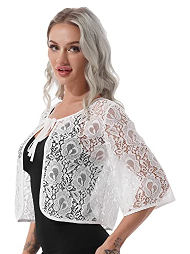 Freebily Coprispalle Donna Cerimonia Elegante Pizzo Floreale Bolero a Manica 3/4 Cardigan Corte Leggero Aperto Davanti Shrug per Matrimonio Nuziale Sposa Battesimo Festa Bianco XL