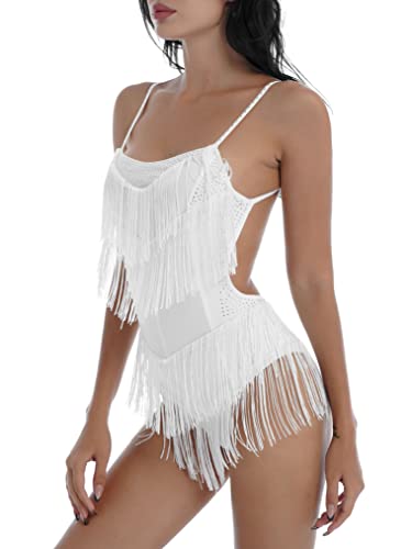 Freebily Vestito da Ballo Donna Latino Americano con Strass Nappa Lustrino Salsa Jazz Abito da Pattinaggio Artistico Backless Vestito Danza Classica Samba Rumba Concorso Bianco L