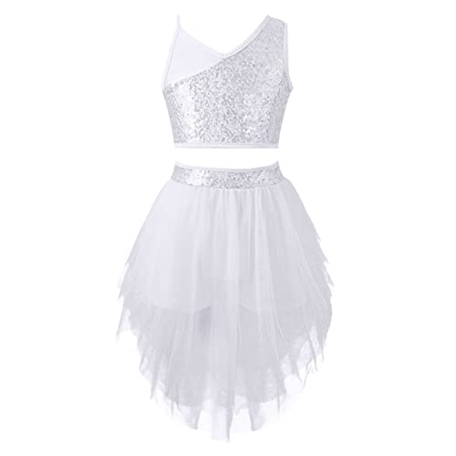 Freebily Vestito Danza Classica Bambina Paillettes Crop Top Canotteria Gonna in Tutu Abito da Pattinaggio Artistico Abito da Ballo Samba Rumba Jazz Balletto Danza Moderna Bianco 12 Anni