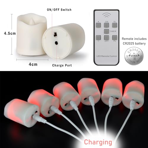 FREEPOWER 6 Candele LED Ricaricabili con Timer Telecomando Fiamma Tremolante, Luce Bianca Calda, Lumini LED Elettriche, Dimmerabili, con Cavo USB, Decorazione per Natale Halloween, 4 x 4.5cm
