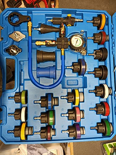Pompa a pressione manuale con manometro con codificatore a colori da 0-35 psi e valvola a pulsante. Display di temperatura. Set di pulizia da 3 pezzi e strumento di rabbocco. 3 adattatori per radiatore in acciaio cromato, 17 adattatori per radiatore, 1 adattatore universale per radiatore e 3 adattatori di controllo per copertura radiatore.