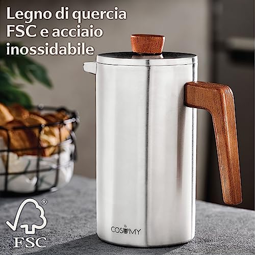 French Press Caffettiera francese 1l - Doppia parete a Acciaio Inox e FSC legno - Mantiene caldo il caffe - 5 Tazze