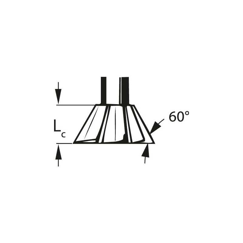 Superficie a trattamento speciale. Forma C per contornare e per fresatura frontale. Nota: Per la fresatura di piccole guide nella realizzazione di stampi o attrezzature. Dati tecnici a umido max. idoneo CuZn m/min limitatamente adatto GG(G) m/min limitatamente adatto Alluminio, plastiche m/min limitatamente adatto Alluminio (a truciolo corto) m/min idoneo Acciaio < 750 N/mm² m/min idoneo Uni m/min idoneo Acciaio < 500 N/mm² m/min idoneo Norma DIN 1833 Tolleranza codolo h6 Angolazione dello smusso angolare Grad 60 Colore collarino senza Rivestimento non rivestito Codolo DIN 1835 B con h6 Tolleranza ⌀ nominale js16 Passaggio interno per LR no Direzione di avanzamento orizzontale Materiale da taglio HSS Co 5 Tipo di prodotto Frese ad angolo Forma C ⌀ Tagliente DC, mm 20 Numero denti Z 8 ⌀ Posizione libera D1, mm 7,8 Avanzamento fz in acciaio < 750 N/mm2, mm 0,08 Lunghezza complessiva L, mm 63 ⌀ Codolo Ds, mm 12 Lunghezza taglienti Lc, mm 8