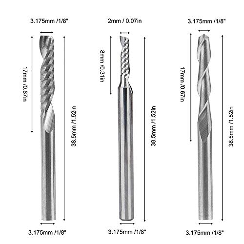 Specifiche del prodotto: materiale: carburo cementato, colore: argento, lunghezza totale: 38,5 mm, lunghezza del bordo di taglio (CEL)/lunghezza della scanalatura: 8 mm, diametro del gambo (SD): 3,175 mm circa. y, diametro di taglio: 2 mm
