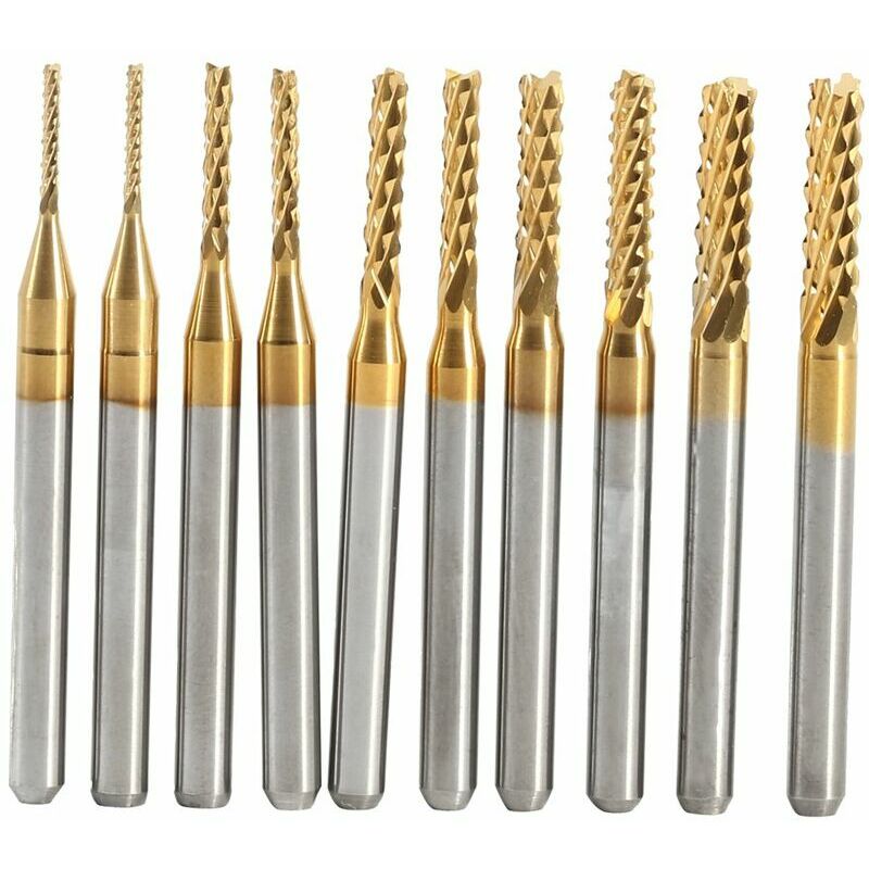 ALTA QUALITÀ: queste frese sono realizzate in metallo duro a grana ultrafine con buone prestazioni di fresatura e taglio, che garantiscono un'elevata efficienza di lavoro. GRANDE PRESTAZIONI: hanno resistenza alla flessione, resistenza all'usura, elevata durezza, elevata resistenza all'usura e alta resistenza. AFFILATE: queste frese a candela hanno spigoli vivi, possono essere utilizzate per fresare fori, scanalature e bordi su piastre e il processo sarà regolare. RIVESTITO E SUPERFICIE LUCIDA: le superfici ben levigate sono molto pulite e non ci sono difetti o sbavature sull'asta, molto sicure per te. TRATTARE CON MATERIALI DIVERSI: Molti oggetti o materiali possono essere incisi come il circuito tavole, metallo, plastica, acciaio inossidabile e rame. Descrizione Questo set di frese è realizzato in carburo cementato a grana ultra fine che garantisce buone prestazioni. fresatura, forme di taglio e alta efficienza lavorativa. Sono di alta resistenza, durezza e resistenza all'usura e i