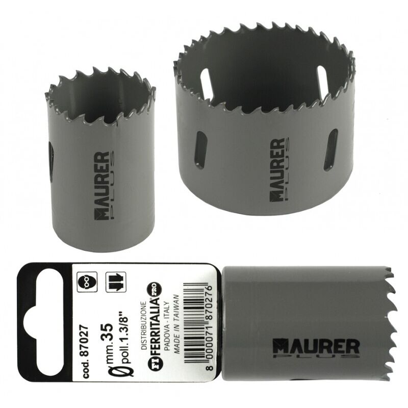 FRESA A TAZZA BIMETALLICA MAURER PLUS 114 - CF. SU PLACCHETTA Ø: 114 mm. Per forare metalli, legno, alluminio, PVC - Adatte per utensili elettrici e pneumatici - Profondità di taglio 38 mm. - Cf. su placchetta