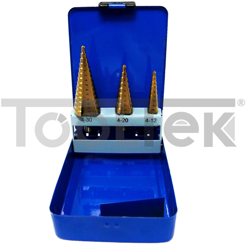 Utilissimo set di frese allargaforo a gradino in HSS .Acciaio ad alta velocità. MISURE: 4-12 mm 4-20 mm 4-30 mm Ideale per i seguenti materiali:metallo, plastica e lamiere di spessore 3 mm senza deformarle.Le frese sono contenute in una valigetta in metallo chiudibile. Prodotto di qualità.