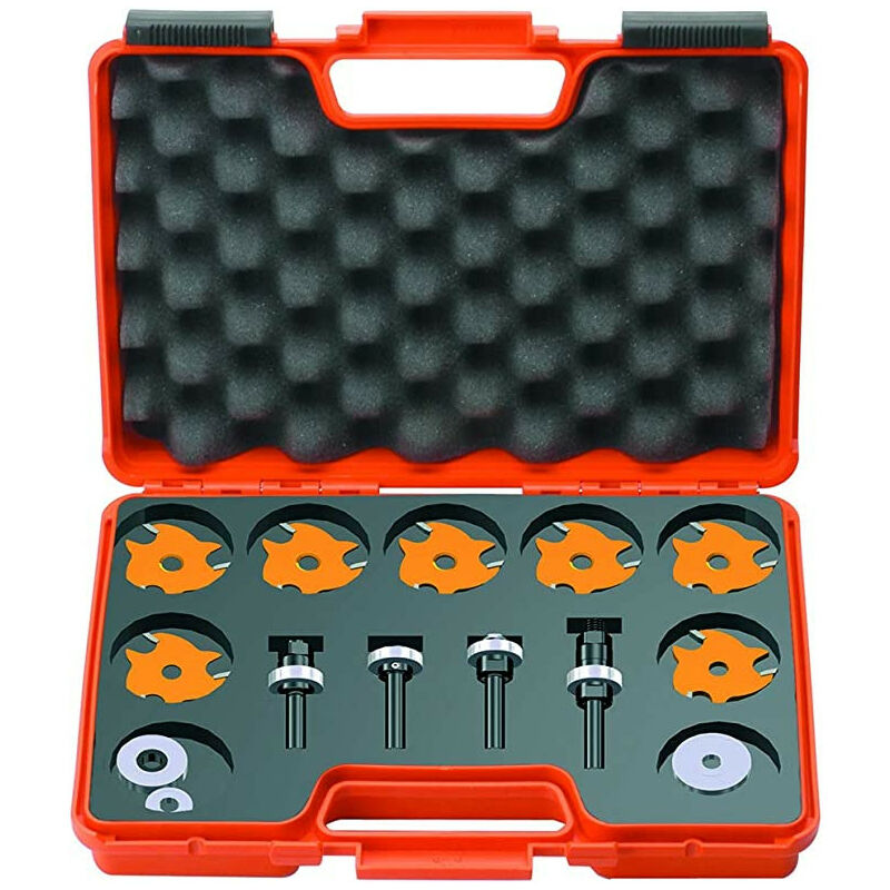 Questo versatile set di frese a disco vi consente di realizzare effetti decorativi o incastri funzionali. Variando la combinazione delle frese a disco potrete produrre canali, gradini, incastri a maschio e femmina, incastri per biscotti in legno e sedi per guarnizioni. - Il set include 7 cuscinetti di 4 diverse misure per fresare diverse profondità di taglio: 8 - 9,5 - 12,8 and 14,3mm. - 7 frese a disco 3 taglienti da 2-3-4-5-6 mm - 4 Gambo portadisco da 8 mm