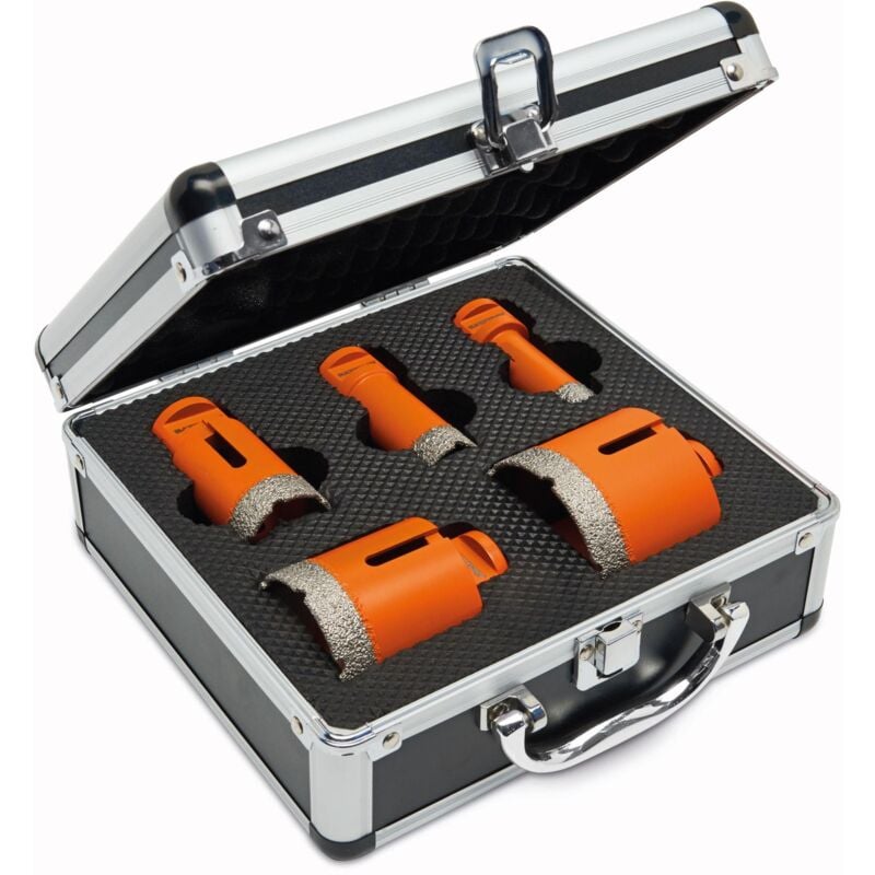 Set di 5 frese diamantate per smerigliatrice Battipav HGSETD. Attacco utensile M14. Utilizzo a secco. Forniti con valigetta in alluminio. Diametro: 20 - 25 - 35 - 55 - 70 mm Giri al minuto: 10000 - 12000 rpm Interfaccia: M14 Spessore max di taglio: 50 mm Materiali: gres porcellanato, pietra naturale, granito, marmo.