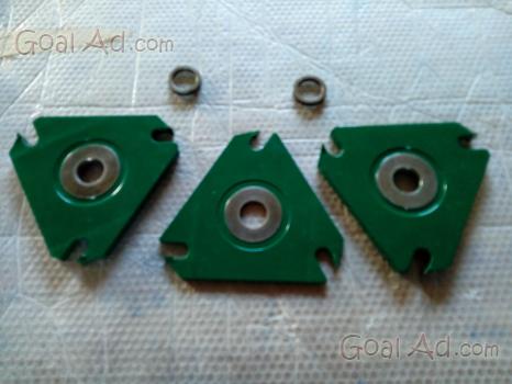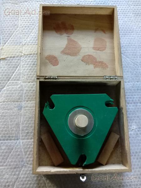 Frese per legno per gruppo Tenoni della Omas misura 24 cm. taglienti al Widia sopra e sotto dritti da 20 mm. e centrale da 8 mm. affilata, foro centrale 35 mm. regolabile in altezza più vari spessori, completa di custodia. ritiro su Grosseto o spedizione