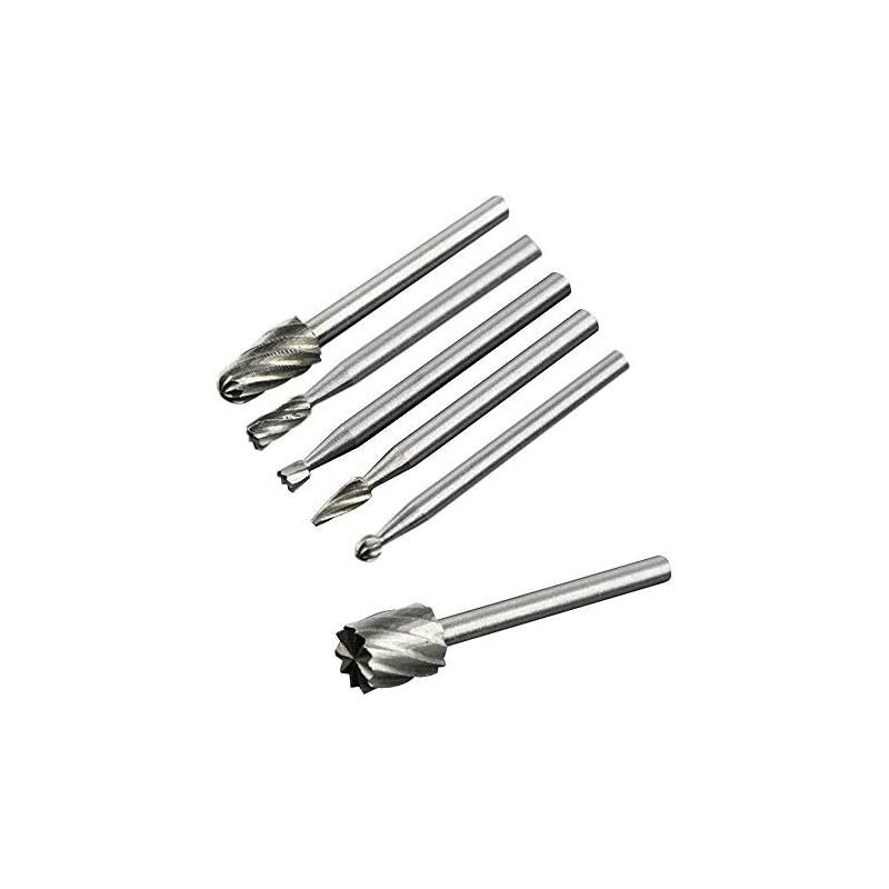 6 forme della testa assortite: conica appuntita, cilindrica, conica inversa, sferica, a goccia, a dente grosso. Codolo da 6,35 mm per l'uso con utensili rotanti, trapani e smerigliatrici. Materiale: carburo di tungsteno - Tipicamente utilizzato con utensili elettrici o pneumatici (può essere utilizzato anche in una macchina utensile). La velocità degli utensili elettrici o pneumatici è generalmente compresa tra 6000 e 40000 giri al minuto. Testa a doppio taglio. Adatto per sbavare e lucidare ghisa, acciaio fuso, acciaio al carbonio, acciaio legato, acciaio inossidabile e altri materiali. Per levigare, lucidare, modellare e lucidare superfici in legno, plastica e gomma. Manufatto di falegnameria lucidato.