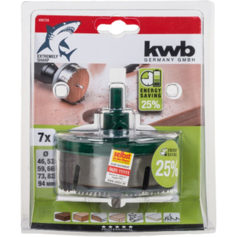 KWB SET 7 FRESE A TAZZA BY EINHELL Con scanalature per trucioli brevettate per una prestazione di lavoro piu' elevata e veloce. Sega a tazza, 7 pz., piatto di supporto in pressogetto di zinco pesante, corone di acciaio per molle indurito, punte dei denti a indurimento induttivo, per l impiego nel legno, in legni rivestiti di plastica, legno duro, pannelli di truciolato, cartongesso, pannelli di costruzione leggera, plastica. Kit da 7 frese a tazza: Diametro mm: 46, 53, 59, 66, 73, 82, 94 Profondita' di taglio: 30 mm