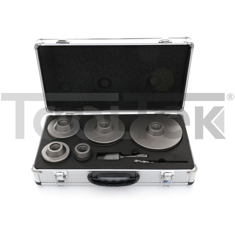 Set frese a tazza da muro il prodotto è progettato per utenti domestici, di officina e di lavoro CARATTERISTICHE: Il set comprende seghe a tazza nelle seguenti misure: 40, 65, 80, 100, 125 mm Montare sul sistema SDS Plus da 110 mm Le seghe a tazza per muratura vengono utilizzate per praticare fori tutti i tipi di materiali, come mattoni, cemento, blocchi, piastrelle, pannelli di gesso e molti altri. Le frese hanno un'estensione che permette il montaggio in trapani con sistema SDS .Le frese hanno un anello dentato realizzato da carburi di carburo Frese a tazza per muratura 5 pezzi1 punta di centraggio foro di lunghezza 120 mm1 adattatore di lunghezza 110 mm attacco SDS-PLUS Prodotto di qualità