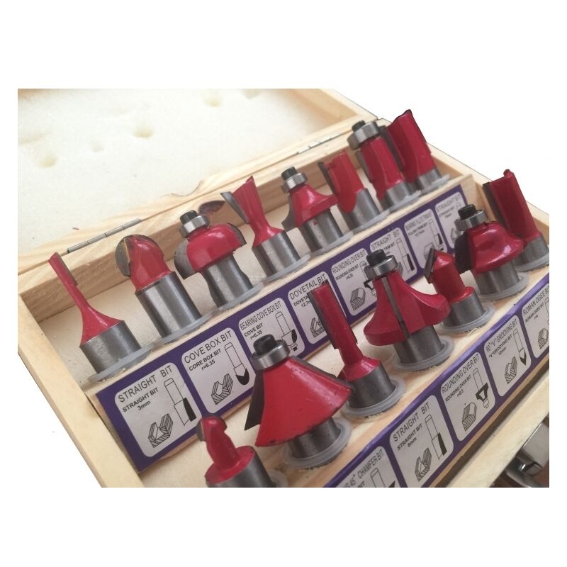 Set di 15 frese a cadolo con gambo da 12,7mm, in acciaio con due taglienti in widia, per pantografo o per fresatrice verticale in comodo box di legno. Ideali per la lavorazione del legno e per la lavorazione e creazione di cornici. Attrezzi indispensabili