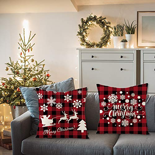 Frgasgds Fodera per Cuscino di Natale, 4 Pezzi Decorazioni Natalizie Fodera per Cuscino in Lino Buon Natale Alce Albero di Natale Decorazioni per la casa Federe per Cuscini Decorativo per Camera Red