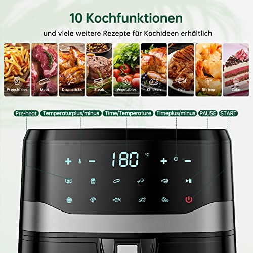 10 programmi e ricette, contenitore per la cottura: friggitrice ad aria calda con 10 programmi di cottura preimpostati (preriscaldamento, patatine fritte, carne, bacchette, bistecca, verdure, pollo, pesce, gamberetti, torte), cucinare facilmente il cibo con il programma corrispondente. La ricetta in dotazione e il vassoio facilitano la cena.