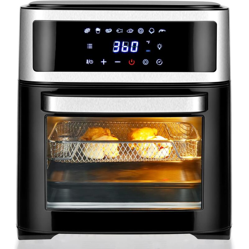 Esperto di Cottura★ Il prodotto si specializza in gastronomia. Usando questo forno, puoi cucinare pollo alla griglia, patatine fritte, pizza e altre prelibatezze a casa. Anche se sei un principiante in cucina, gli otto programmi previsti ti aiutano a diventare un cuoco eccellente del ristorante a cinque stelle. ★Cibo Sano★ Come tutti sanno, il cibo fritto non è salutare. Invece di cucinare il cibo con l'olio caldo, il forno riscalda le pietanze utilizzando la veloce circolazione dell'aria a 360 gradi. La cottura senza olio ti fornisce un nuovo metodo con cui non devi preoccuparti per l'aumento di peso. ★Grande Volume★ Il forno di 13 litri può contenere più cibi di pentola per friggere e, la misura del forno è più piccola di quella del forno a microonde. Il forno con grande capacità è adatto alla famiglia, anche nelle feste, puoi alleggerirti il lavoro di preparare il cibo per più persone con questo forno. ★Operazione Facile★ Il forno è munito dello schermo touch su cui è predisposta