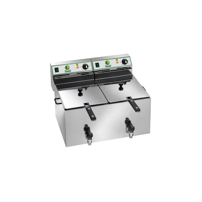 Codice RS0999 - Friggitrice elettrica da banco a 2 vasche, modello FI-FR88R, 230 volt, 3.0+3.0 kw, dimensioni cm. 56.5x49x36.5 (lxpxh), vasca da lt.8+8, capacità cesto 1+1 kg, produzione oraria 8+8 kg, temperatura di lavoro 50-190°C. Struttura, vasca e coperchio in acciaio inox. Cestelli a rete estraibili in filo cromato. Manici cestelli e pomelli coperchi in plastica termoisolante. Resistenze inox. Termostato di sicurezza con pulsante di ripristino. Testata e resistenze removibili. Rubinetto di scarico. Doppio termostato per l'utilizzo indipendente delle vasche.