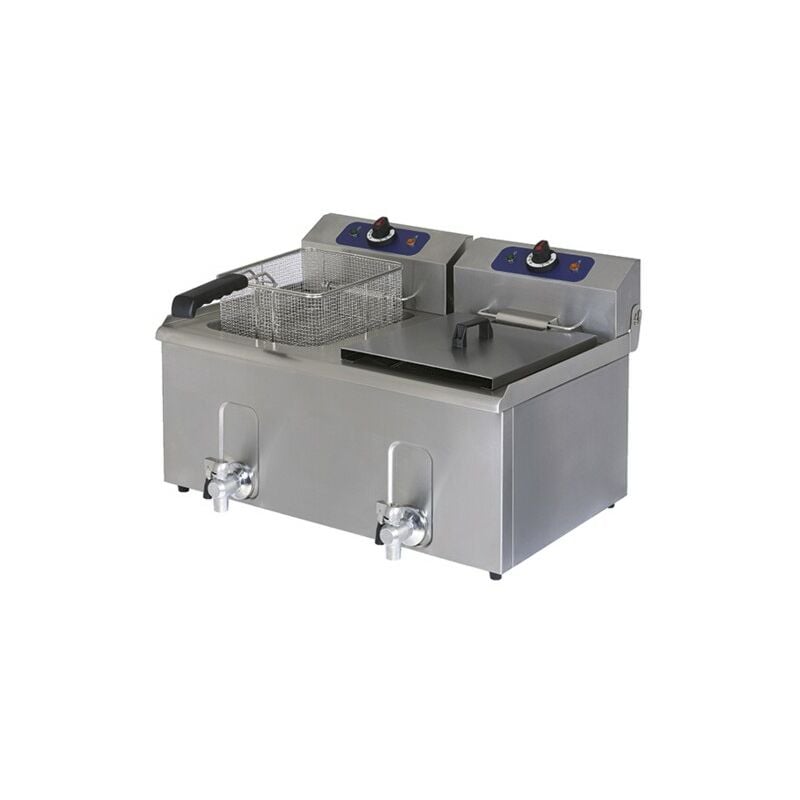 Codice RS1040 - Friggitrice elettrica da banco a 2 vasche, modello ST-1241G, 230 volt, 3.3+3.3 kw, dimensioni cm. 61.5x55.5x40 (lxpxh), dotata di n.2 cesti da cm. 25x20x12h, vasche da lt.12+12, capacità olio lt.8+8. Vasche imbutite con zona fredda. Testate resistenze estraibili con interruttore generale. Termostati regolazione 50-180 °C e sicurezza 240 °C. Microinterruttori di sicurezza sulle testate delle resistenze. Rubinetti di scarico con sicurezza.