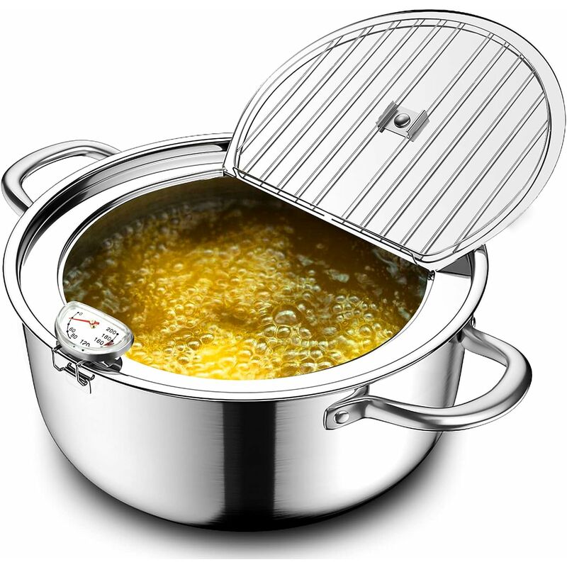 PENTOLA PER FRIGGITRICE IN ACCIAIO INOSSIDABILE DI QUALITÀ: è realizzata in acciaio inossidabile 304 per uso alimentare per una migliore salute e durata, antiaderente e facile da pulire, tutti i componenti sono realizzati in acciaio inossidabile di alta qualità con una lavorazione artigianale lucidata a specchio, il che significa nessun rivestimento, resistente alla corrosione.Fondo composito a doppio strato, riscaldamento uniforme e risparmio energetico.La parete e il fondo della pentola sono spessi, sicuri e hanno una lunga durata. /p> DESIGN SEMPLICE E DELICATO: il termometro allegato rende controllo della temperatura dell'olio più accurato.Termometro bimetallico, senza liquidi all'interno e assolutamente sicuro.Pentola con porta bypass,Il design della porta del deviatore del beccuccio facilita il versamento dell'olio da cucina.Il coperchio della pentola può essere rimosso per un lavaggio più facile. La griglia rimovibile può drenare l'olio in eccesso dal cibo. AMPIAMENTE