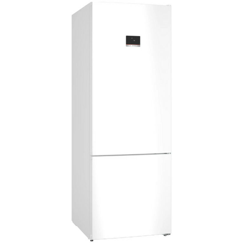 Frigorifero combinato Bosch Serie 4 KGN56XWEA NoFrost XXL con vani portaoggetti VitaFresh e grande capacità: conserva i cibi più a lungo. No Frost: lo sbrinamento del frigorifero e del congelatore è terminato. Capacità XXL: ancora più spazio per i tuoi prodotti freschi. VitaFresh mantiene i cibi freschi croccanti più a lungo: grazie a temperature molto basse per carne e pesce e livelli di umidità regolabili per frutta e verdura. Illuminazione LED: illuminazione uniforme del tuo frigorifero, senza abbagliamento. Vestibilità perfetta: installare il frigorifero direttamente contro il muro o contro un altro elettrodomestico non è più un problema. Tipo di prodotto: frigorifero combinato. Tipologia costruttiva: Autoportante. Volume totale: 508 l. Classe di efficienza energetica E su una scala da A a G. Consumo energetico: 262 kWh/anno. NoFrost MultiAirflow. Porte bianche. Maniglie verticali integrate. Regolazione elettronica con display della temperatura a LED. Ciascuna zona di temperatura