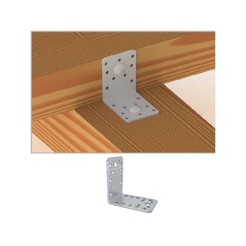 KIT da 10 Pezzi di piastra di fissaggio angolare L70 x H70 x 55 - spessore mm.2,5 foro viti 11 mm. - foro chiodi 5 mm. Le piastre di fissaggio angolari vengono realizzate in lamiera d'acciaio zincata dello spessore di 2,5 mm. Applicazioni: Le piastre di fissaggio angolari 70 sono idonee per giunzioni di elementi in legno sottoposte a carichi limitati.