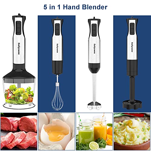 Set frullatore 5 in 1: il set di frullatore Dailyswee 5 in 1 include albero di miscelazione, frusta in acciaio inox 304, accessori per schiacciare patate, tritatutto da 500 ml, misurino da 600 ml. Perfetto per succhi di frutta, frullati, zuppe, schiuma di latte di caffè, frappè o alimenti per bambini come fiocchi d'avena e zuppe di verdura, per soddisfare le vostre diverse esigenze di cibo delizioso.