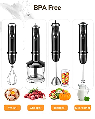 【1000W 5 IN 1 FRULLATORE A IMMERSIONE MULTIFUNZIONE】Makoloce frullatore a immersione ha un Chopper con coperchio a prova di schizzi [tritacarne],frullatore,frusta e montalatte,che può facilmente gestire una varietà di ingredienti e aiutarti a preparare pizza,pappe,torte e dessert,vari marmellate e succhi,ecc.L'impostazione di potenza super 1000 W può aiutarti a schiacciare facilmente gli ingredienti.
