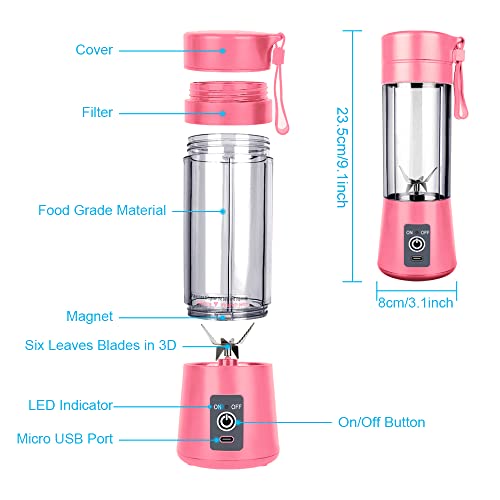 Frullatore Portatile, Ksera Smoothie Juicer Cup, Mini Frullatore Personale per Frullati e Frullati - Sei Lame in 3D, Potente Spremiagrumi Portatile da Viaggio USB Ricaricabile da Casa (Rosa)