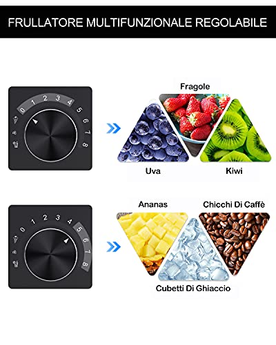 【8 Lame in Acciaio Inossidabile Rinforzato per uso Alimentare】. Il frullatore con 8 robuste lame integrate in acciaio inossidabile di standard tedesco offre una triturazione perfetta che rende il frullatore più fluido e veloce. Il ghiaccio e la frutta congelata vengono tritati in pochi secondi. Questo frullatore funge da spremiagrumi, tritatutto, macinacaffè e frullatore di ghiaccio per molteplici usi.