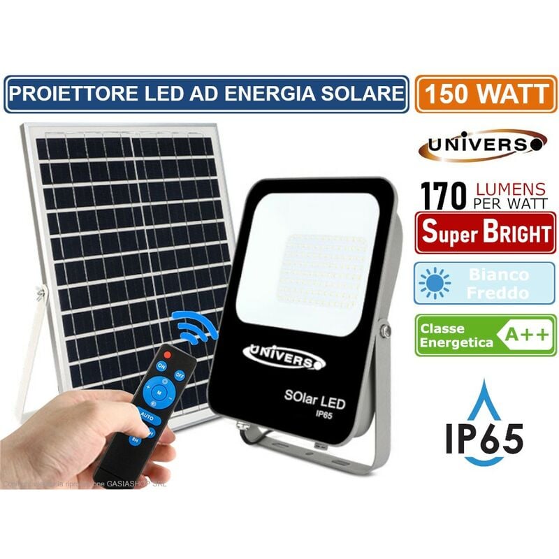 Faro LED Universo FSO-150W con potenza equivalente di 150W e corpo in alluminio di colore nero. Composto di 2 unità separate: pannello solare in policristallino con staffa di fissaggio e faro con batteria integrata. Adatto all'uso esterno grazie al grado di protezione IP65 . LED SMD con fascio luminoso di 120° e flusso luminoso di 170 lm/W . Questo faro ha la particolarità di essere autonomo e quindi installabile anche in luoghi dove non arriva la corrente elettrica. É equipaggiato con una batteria ricaricabile e un pannello solare che garantiscono un'autonomia di 10/12 ore (tempo di ricarica di 5/6 ore). La particolarità di questo faro è avere il pannello solare separato, con un cavo della lunghezza di 3 metri . In questo modo è possibile posizionare il pannello esposto al sole, e il faro all'interno (come ad esempio un garage). Grazie al telecomando incluso (2 pile AAA incluse) è possibile accendere e spegnere il faro, regolare l'intensità luminosa (100% / 50%), settare diversi