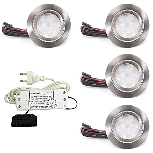 4 faretti LED da incasso per mobili, 3 W, cromo opaco, 3000 K, bianco caldo