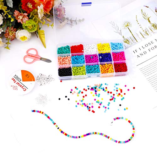 Set di perline di grande valore: tra cui 3500 pezzi di 15 perle di semi di vetro di diversi colori, fermagli di aragosta 20 pezzi, anelli di salto 100 pezzi, 1 rotolo di filo di cristallo elastico e 1 scatola di immagazzinaggio da 15 griglie. Ottimo per bracciali, collane e gioielli.
