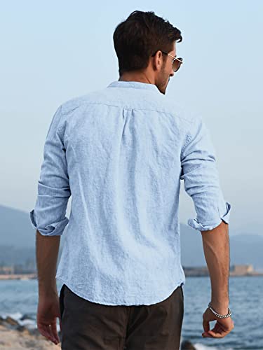 FUERI Camicia da uomo a maniche lunghe, in cotone e lino, stile casual, con bottoni a fascia, leggera, estiva, a-blu, L