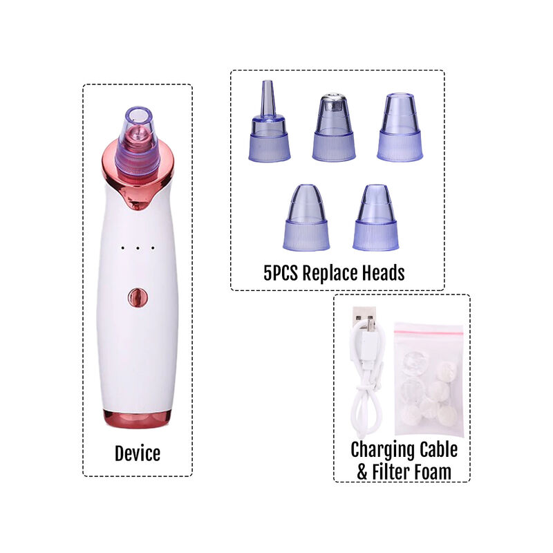 4. Dopo la pulizia, lavare con acqua fredda, applicare la maschera, utilizzare i prodotti emollienti, mantenere il viso idratato Lista di imballaggio: 1 pz * strumento di rimozione di punti neri1 pz * cavo USB5 pezzi * testa