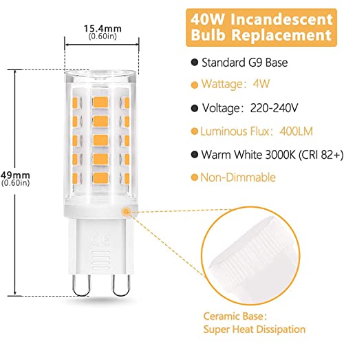 Fulighture Lampadine G9 LED, 4W Equivalenti a 40W, 400lm, Luce Bianca Calda 3000K, per Armadi, Applique da Cucina, Plafoniere, Lampade da Tavolo, Luci da Accento, Non Dimmerabile, 6 Pezzi
