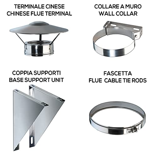 NEL KIT: 1 Terminale cinese, 10 Tubi m.1, 2 Tee, 1 Raccordo caldaia, 1 Piastra di intermedia, 1 Scarico Condensa, 1 Coppia supporti, 1 Collare a muro, 1 Tappo cieco, 15 Fascette, 15 Gurnizioni.