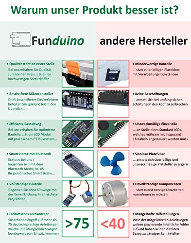 This kit contains the basic learning-kit from Funduino. Additional content: + 1x Relais shield for Arduino +1x IR remote + 1x Stepper motor with driver