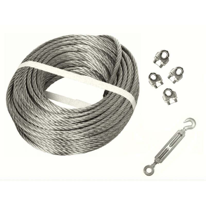 FUNE COMMERCIALE + TENDITORE MORSETTO ACCIAIO OCCHIO GANCIO VERRICELLO 6MM 25MT KIT COMPOSTO DA FUNE IN ACCIAIO ZINCATA AVENTE DIAMETRO 6 mm FORMAZIONE: 72 fili (12x6+7AT) CARICO DI ROTTURA: + 1200 Kg LUNGHEZZA FUNE: 25 metri + TENDITORE OCCHIO-GANCIO IN ACCIAIO ZINCATO 6 mm + 4X MORSETTI PER FUNE ACCIAIO ZINCATO 6 mm
